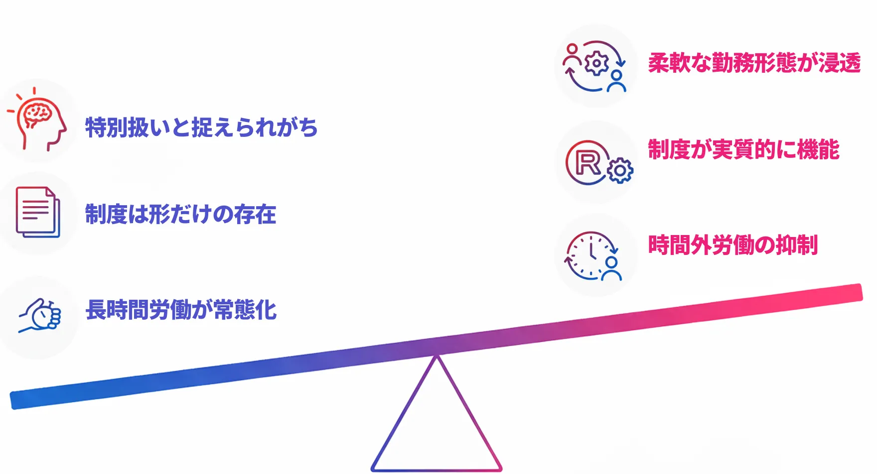 - 職場の空気も「制度を使う=特別扱い」と捉えられがちで、気軽には使えない雰囲気