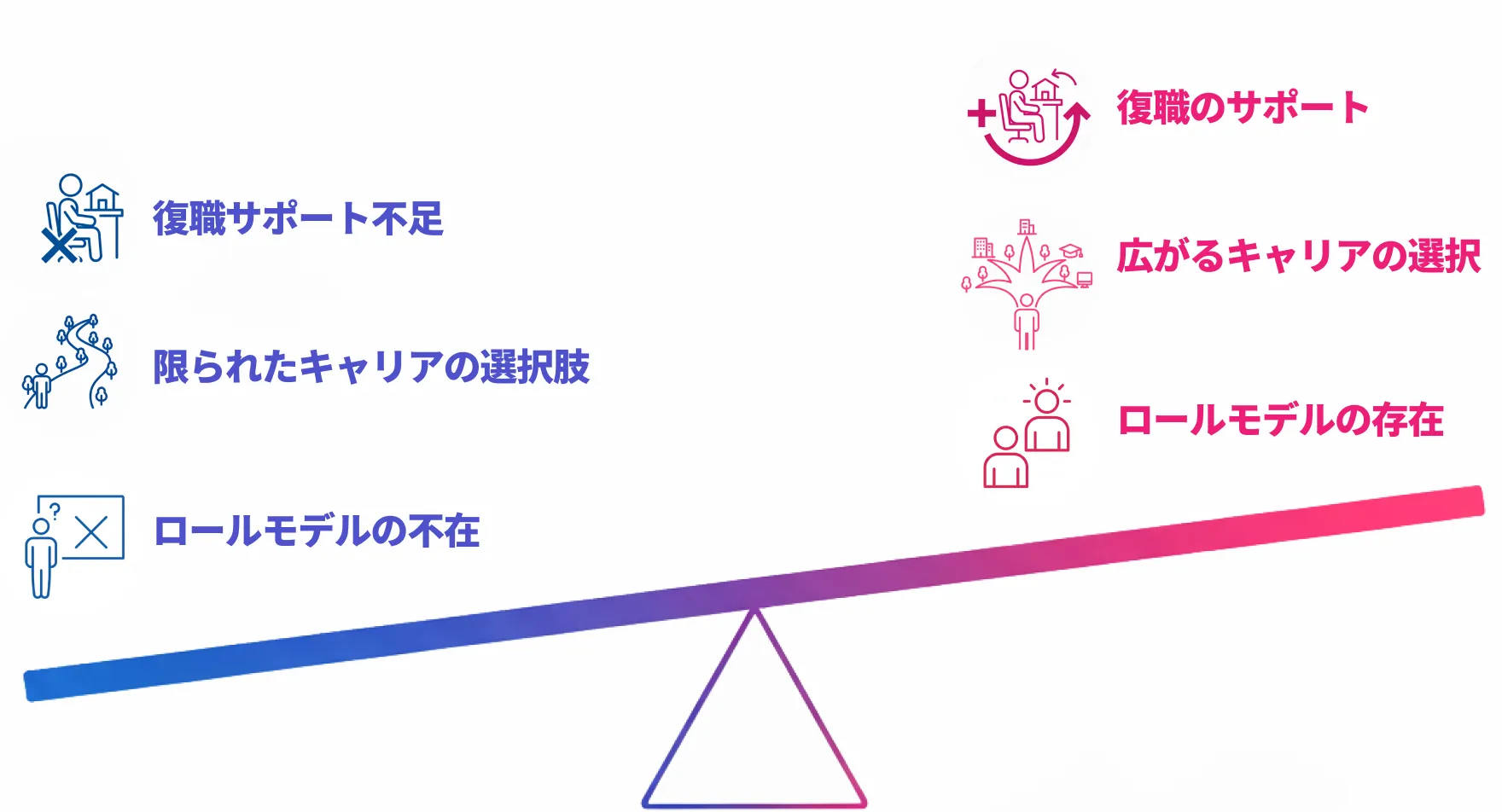 - 現場に復帰するための仕組みや研修制度も整っておらず、離職後の復職が高いハードルに